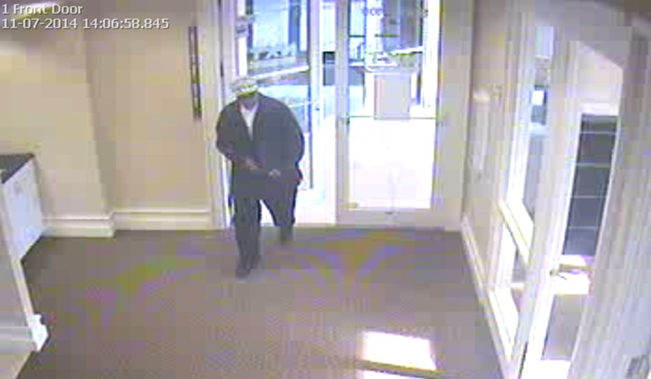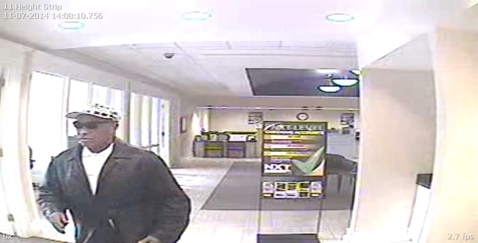 The Coralville Police Department is asking for assistance in identifying the male in the pictures below. On Friday, November 7, 2014, at approximately 2:08 PM, Coralville Police responded to a reported robbery at NXT Bank, 119 2nd Street, Coralville. A lone black male, 40 – 50 years old, approximately 6’0”, 225 lbs., medium build, passed a note to a teller demanding cash. No weapon was displayed and no one was injured. The offender fled with an unknown amount of money and was last seen on foot headed east from the bank.