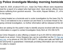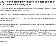 Iowa City Police are asking for assistance in identifying the owner of the truck pictured below. It was used in the theft of an enclosed trailer from Industrial Park Rd. in March. (#2018002515) Iowa City Area CrimeStoppers is offering a reward of up to $1000 for information leading to the arrest of the suspect. Anyone […]